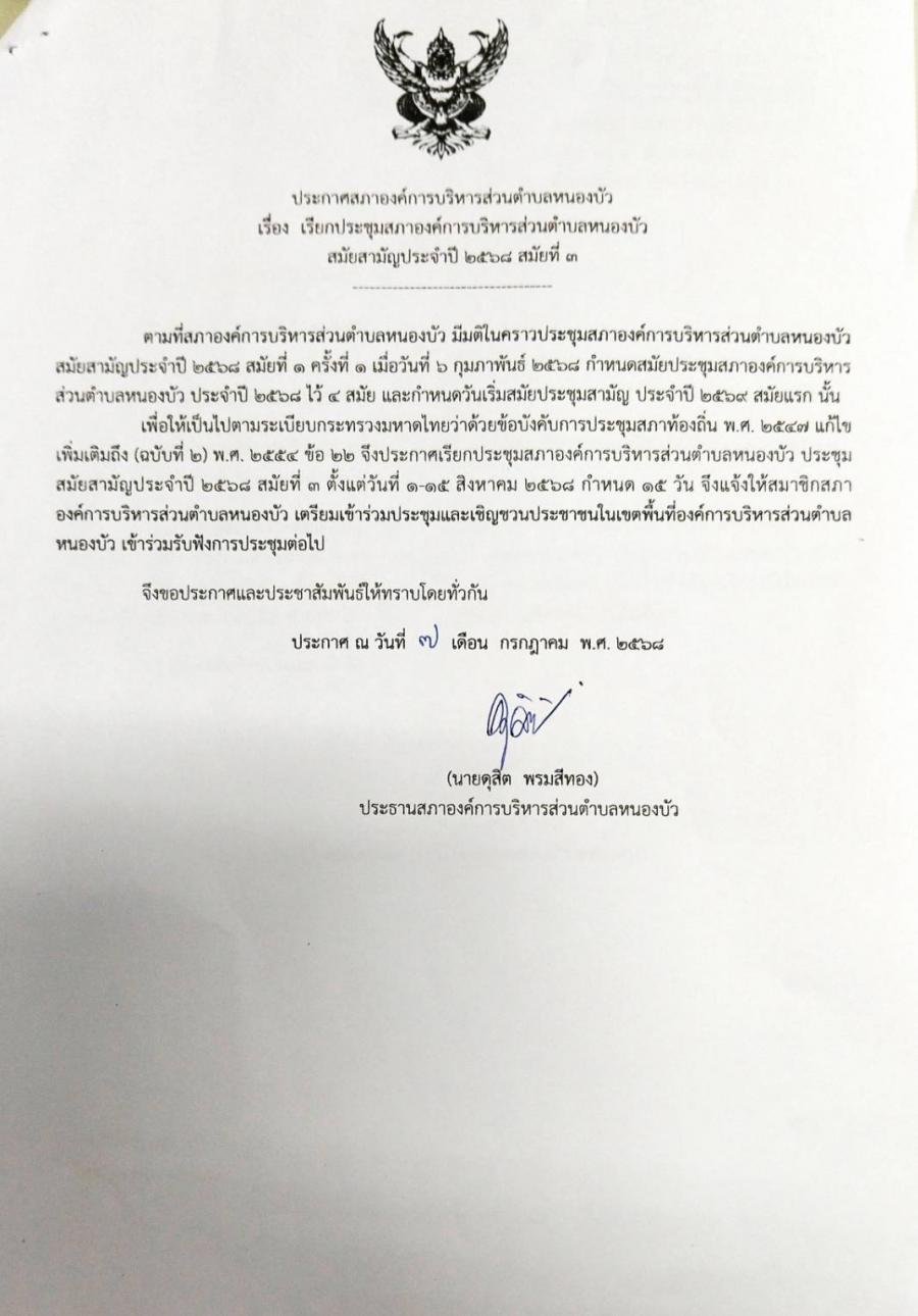 สภา อบต.หนองบัว ประกาศเรียกประชุมสภาองค์การบริหารส่วนตำบลหนองบัว ประชุมสมัยสามัญ ประจำปี 2568 สมัยที่ 3 ตั้งแต่วันที่ 1-15 สิงหาคม 2568 และขอเชิญชวนประชาชนในเขตพื้นที่องค์การบริหารส่วนตำบลหนองบัวเข้าร่วมรับฟังการประชุม